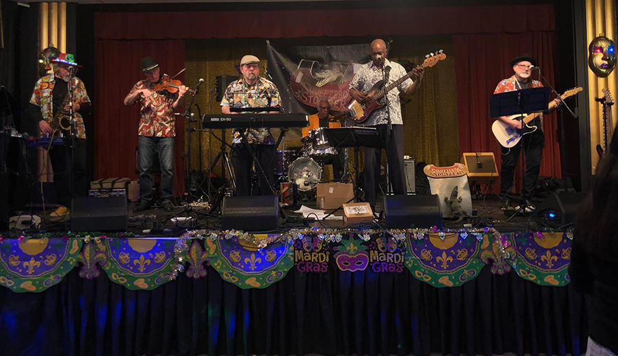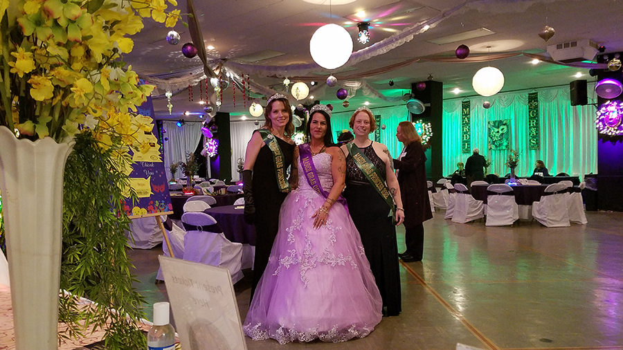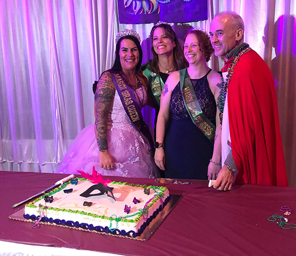 ![]() The Royal Court After Cutting the Cake at the Mardi Gras Ball. Queen Desiree Archambault, Princesses Stephanie Santoro and Tabitha Westerhuis and King Dan Gendron. |
